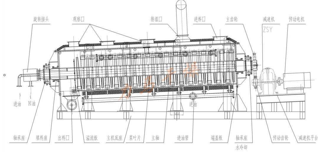設備的核心是兩根空心軸和焊在軸上的空心攪拌槳葉。槳葉形狀為楔形的空心半圓形,可以通入加熱介質(zhì)。除了起攪拌作用外,也是設備的的傳熱體。槳葉的兩主要傳熱側面成斜面,因此當物料與斜面接觸時(shí),隨著(zhù)葉片的旋轉,顆粒很快就從斜面滑開(kāi),使傳熱表面不斷更新,強化了傳熱。在槳葉的三角形底部設有刮板,以將沉積于殼底的物料刮起,防止產(chǎn)生死角。